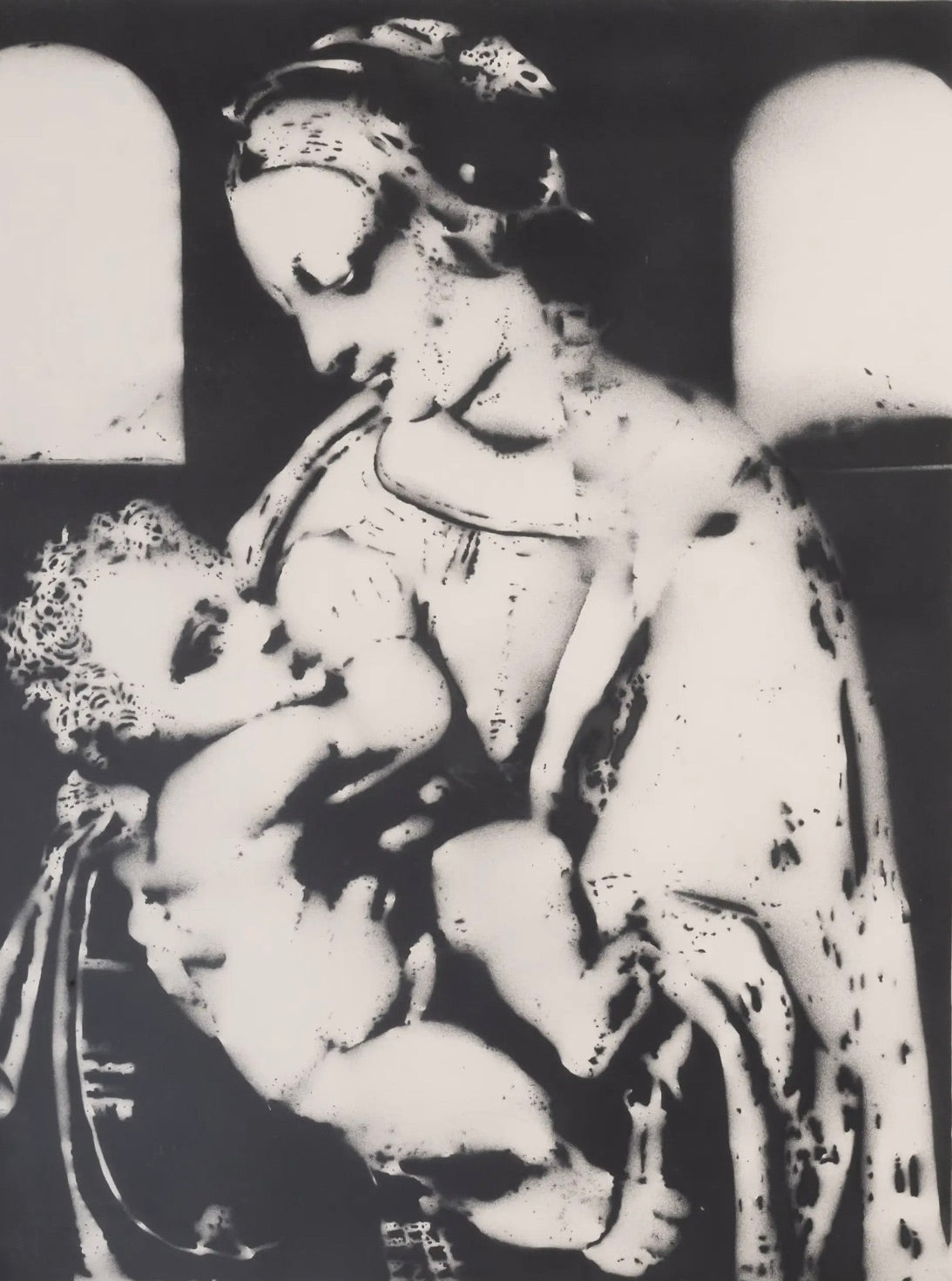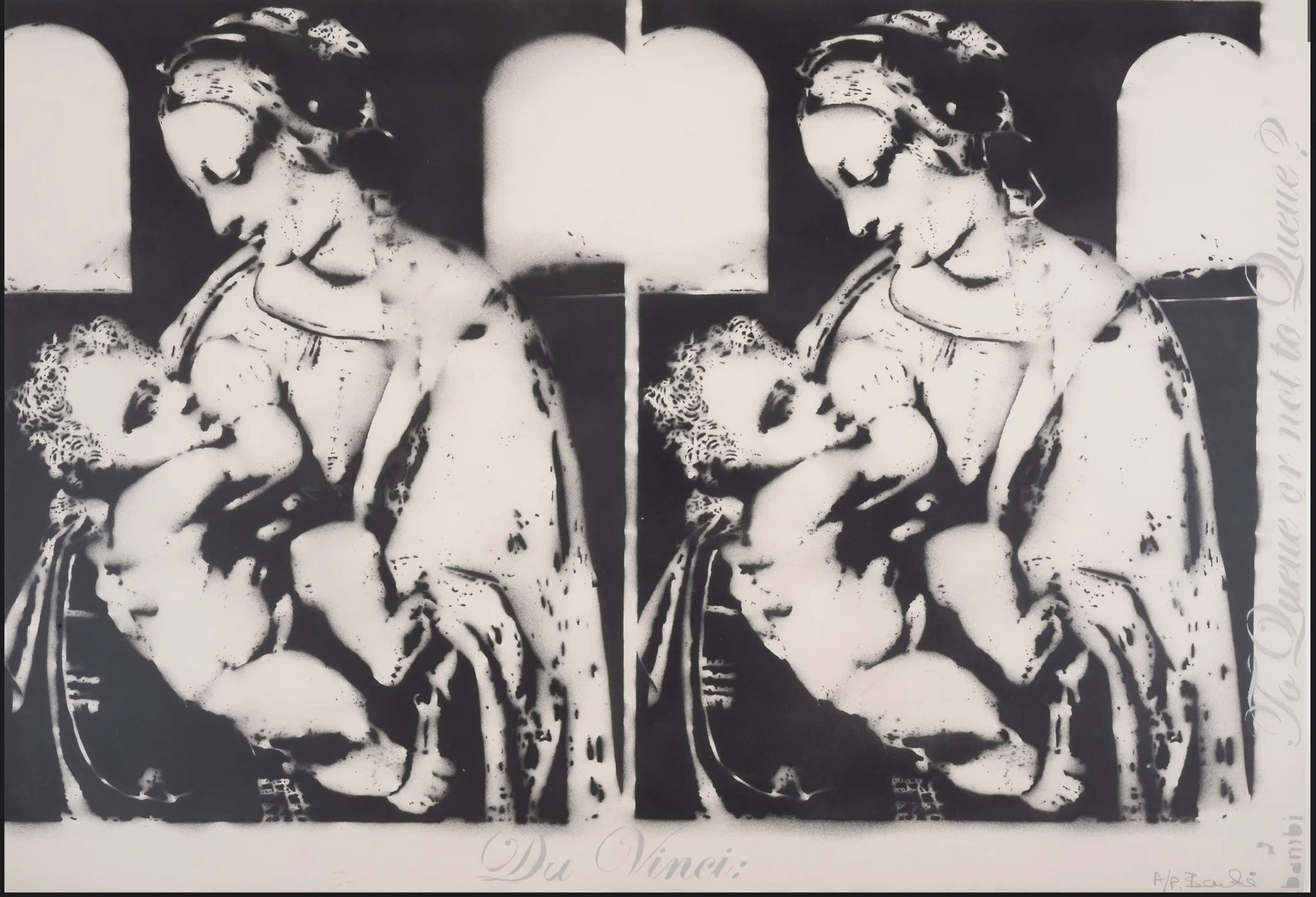 This powerful screenprint by acclaimed British street artist Bambi blends classical inspiration with contemporary commentary. Referencing Leonardo da Vinci’s iconic Madonna and Child, Bambi reimagines the Renaissance composition through a bold, urban lens—juxtaposing sacred imagery with the tension and irony of modern life.