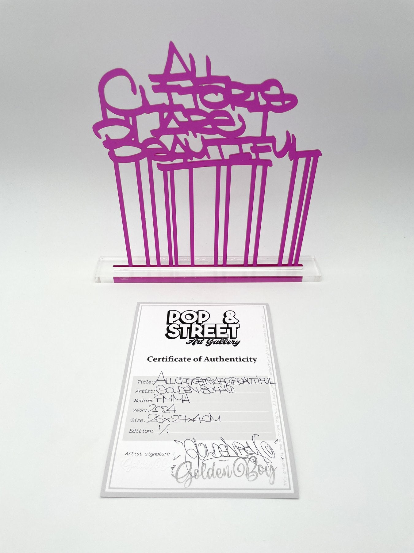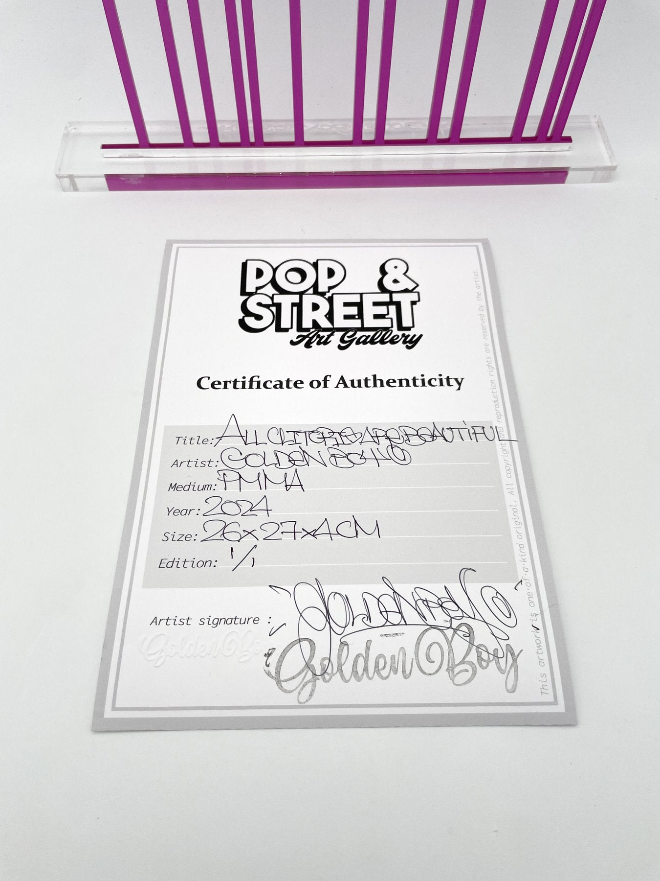 Original cut-out calligraphy and its pmma base signed by the artist accompanied by a certificate of authenticity from the Pop & Street Gallery signed and stamped by the artist.