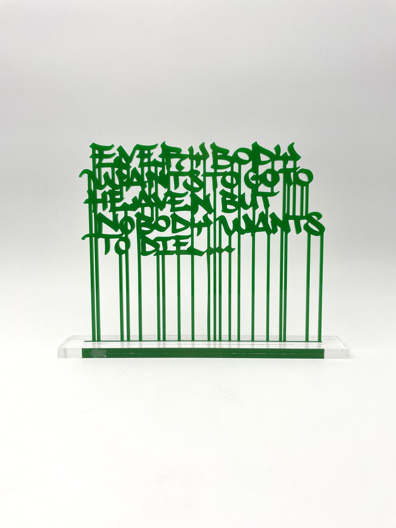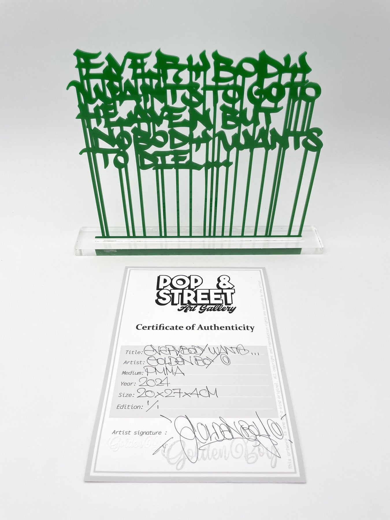 This thought-provoking work by Golden Boy captures the artist's signature boldness and humor, featuring the famous quote "EVERYBODY WANTS TO GO TO HEAVEN BUT NOBODY WANTS TO DIE..." in striking cut-out calligraphy. Mounted on a PMMA base with wood, the piece is hand-signed and comes with a certificate of authenticity from Pop & Street Gallery, ensuring its exclusivity.