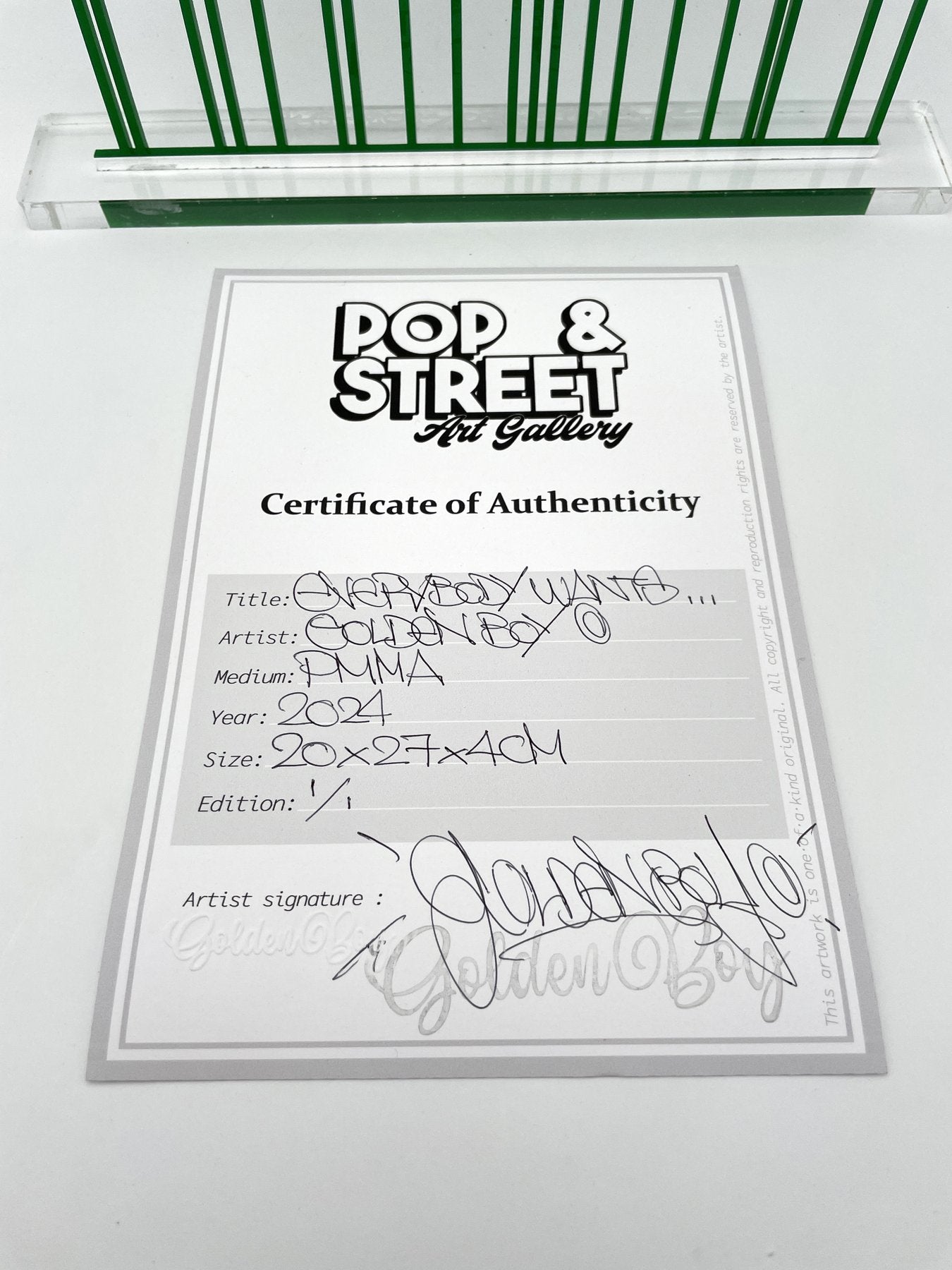 - Condition: Hand-signed by the artist, accompanied by a certificate of authenticity signed and stamped by Pop & Street Gallery