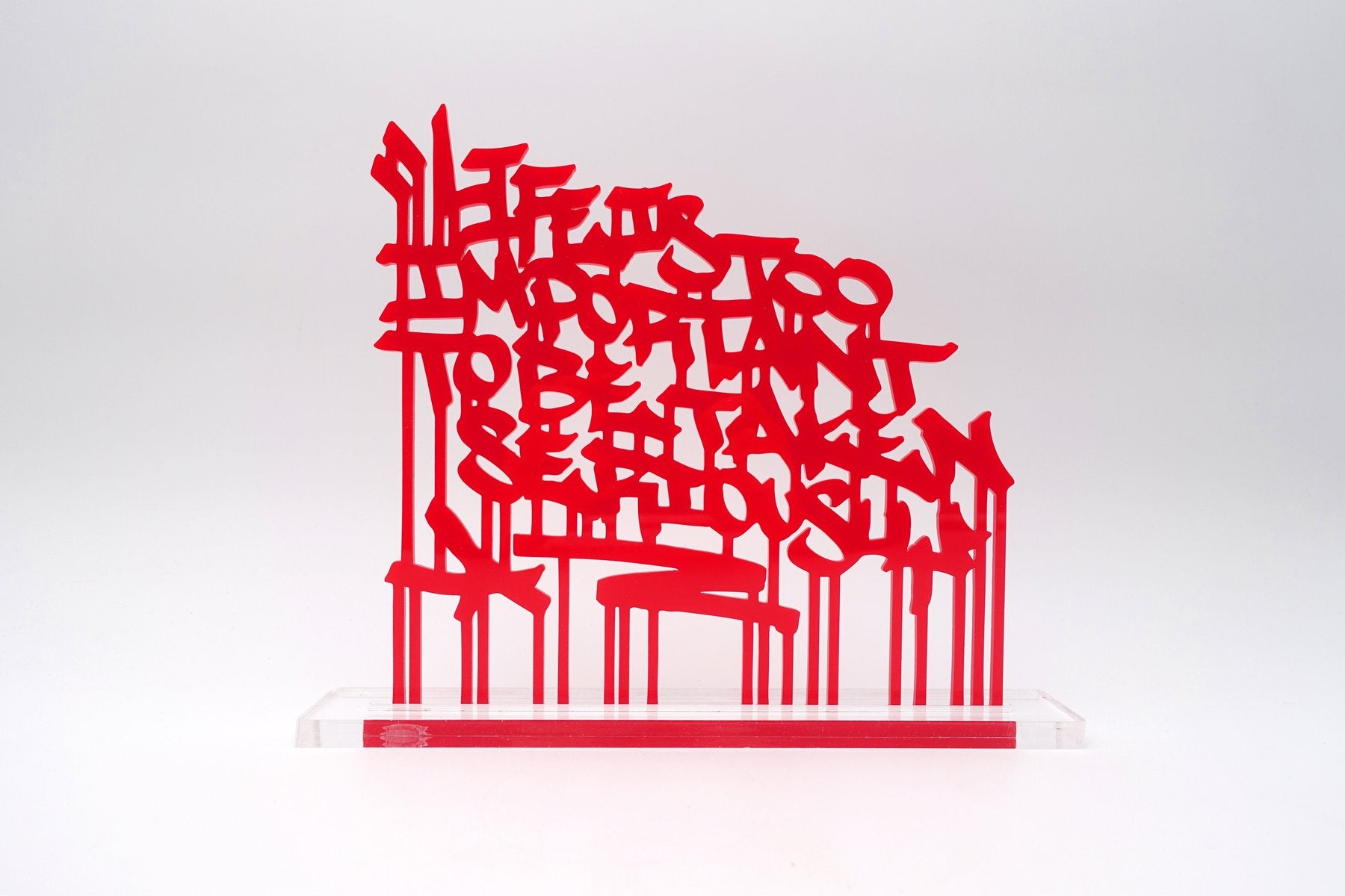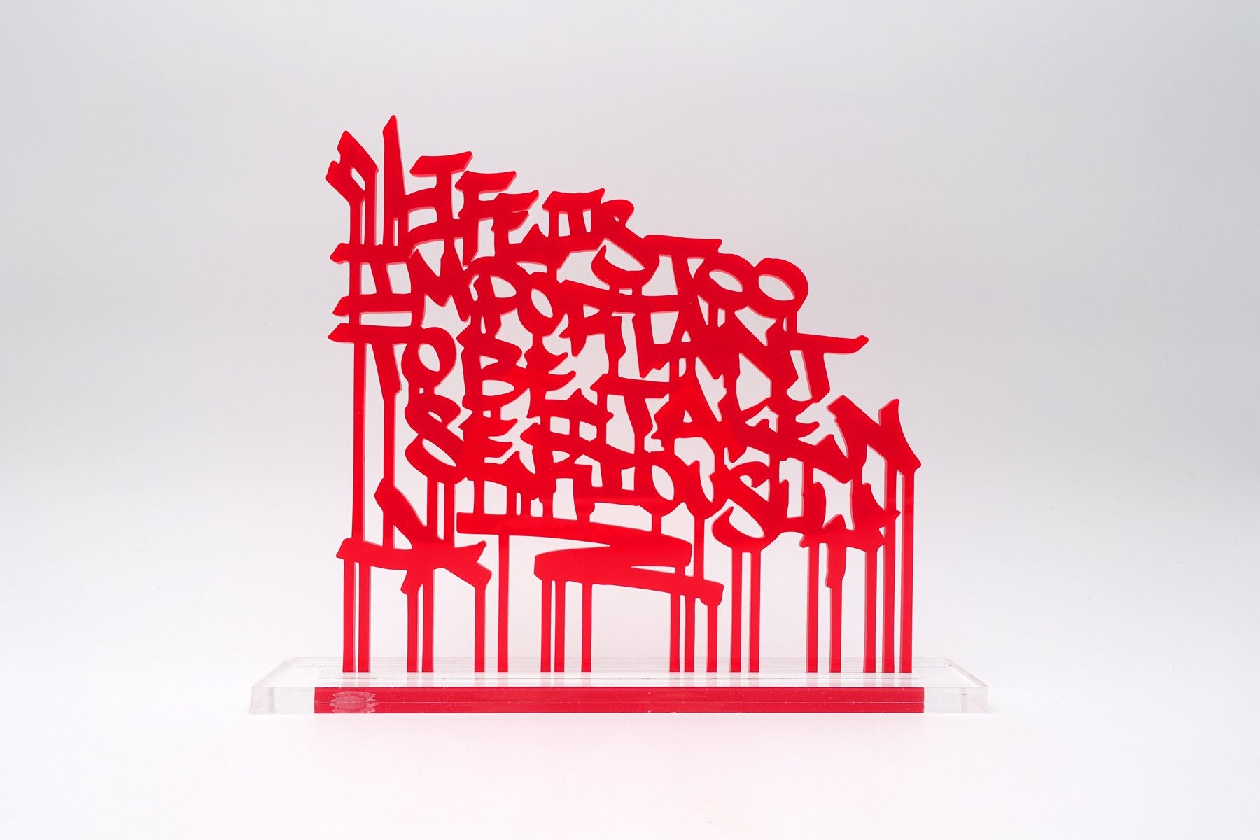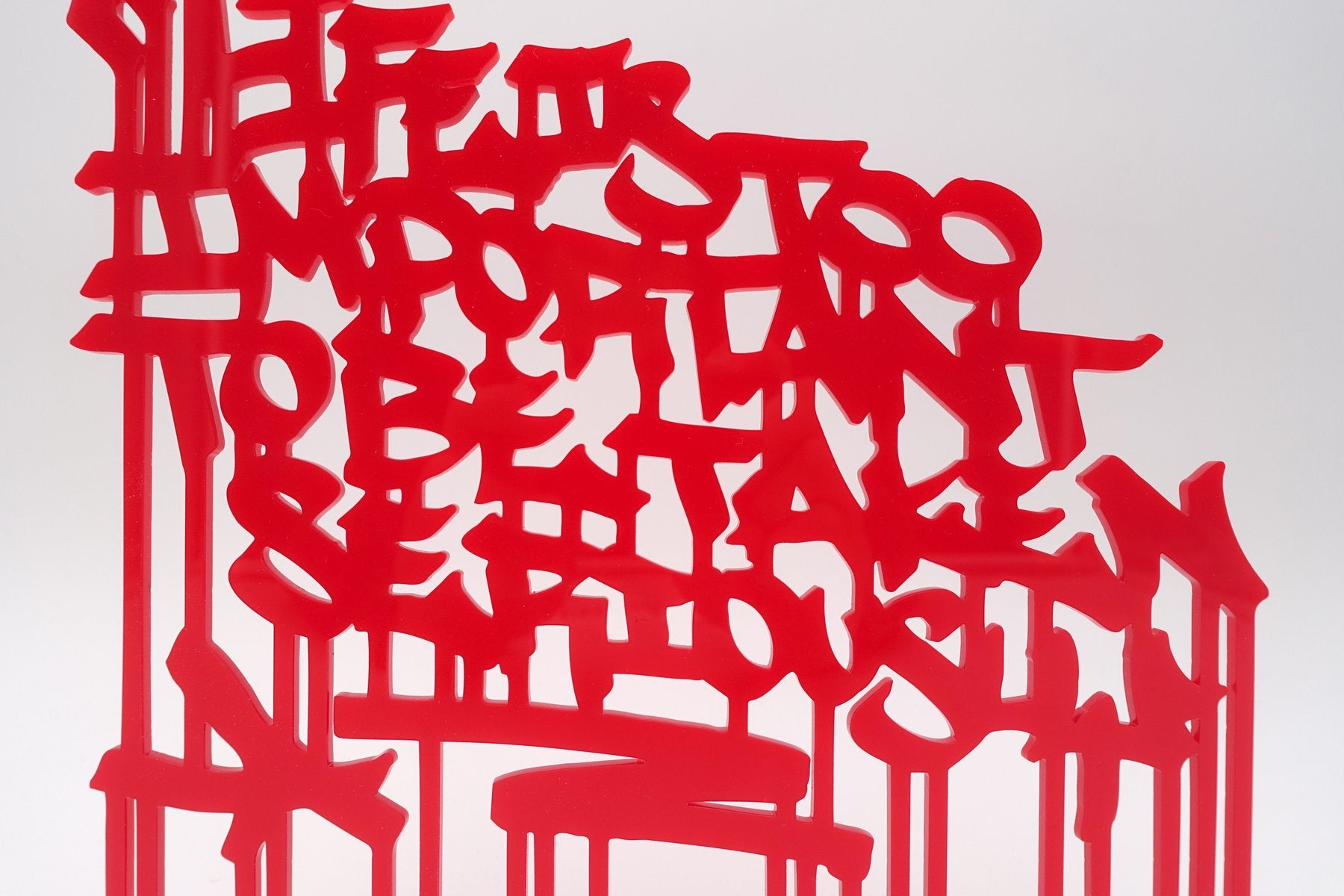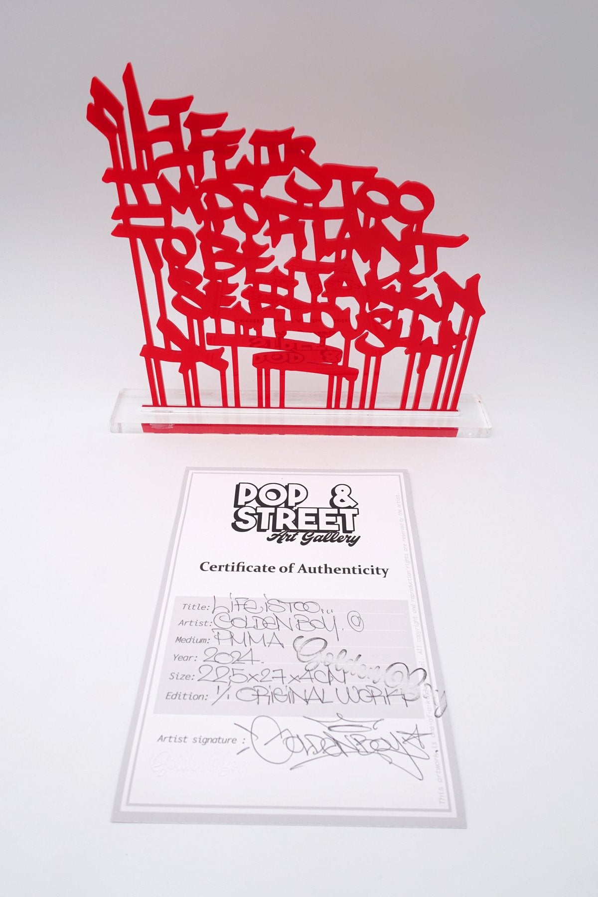 This bold and luxurious piece by Golden Boy, known for his witty commentary on wealth and modern culture, features an elegant calligraphy cutout with its signed PMMA base. The phrase "Life is Too Important to Be Taken Seriously" reflects his signature blend of humor and street art influences.