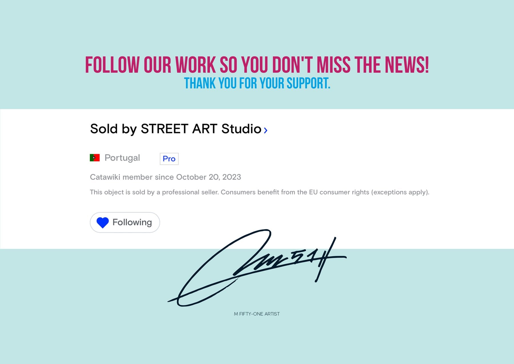 In Memory of All Refugees is a poignant and thought-provoking unique artwork by M51. Combining giclée printing with acrylic paints, markers, and spray paint, this piece highlights the artist's deep reflection on the refugee crisis. The use of mixed media on high-quality fine art paper creates a powerful visual that resonates with urgency and empathy.