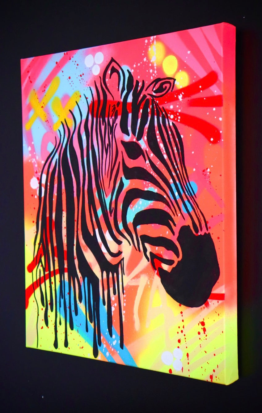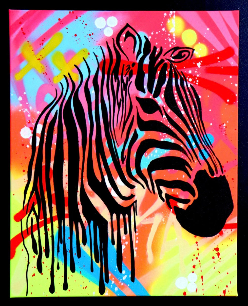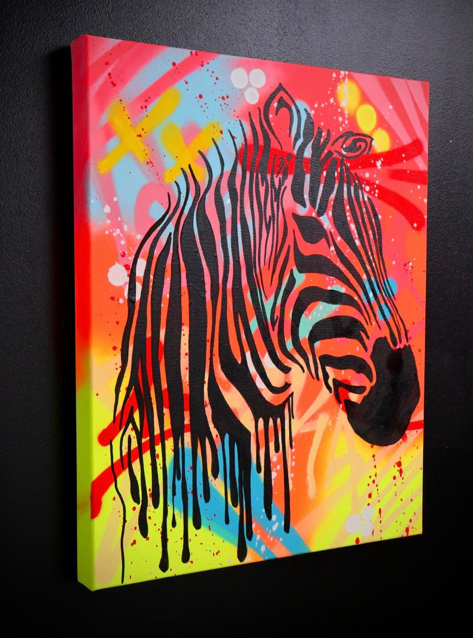 This one-of-a-kind masterpiece by Socrates showcases a captivating blend of spray paint, acrylic, and marker, perfectly balanced on premium cotton canvas. Mounted on a 3D frame, Zebries is an eye-catching statement piece for any contemporary art lover.