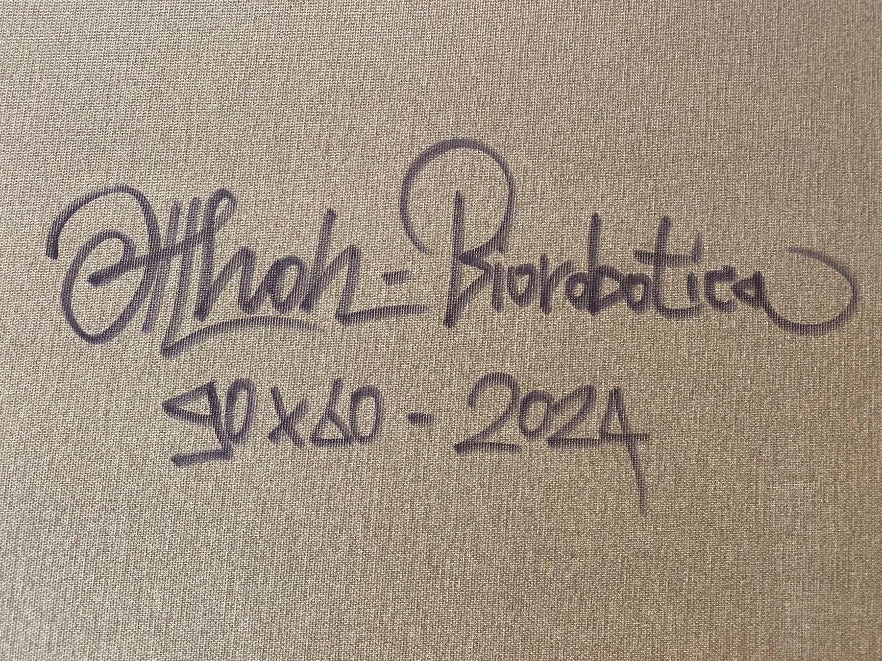 Biorobotica by Otthon is a striking original piece that merges stencil art and spray paint to create a thought-provoking vision of technology and humanity. This hand-painted artwork on canvas is a one-of-a-kind creation that captures the artist’s unique style and innovation.