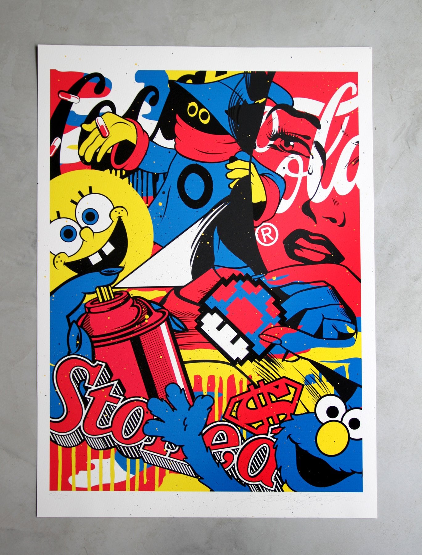 Stoned by Peter Stark is a dynamic fusion of spray paint and giclée print, creating a unique visual experience. Printed on high-quality, archival matte textured paper, this piece offers rich, vibrant colors that enhance its contemporary appeal. As a limited edition of only 20, each work is individually numbered and signed, adding to its exclusivity. In perfect condition and never framed, it is ready for your personal touch.