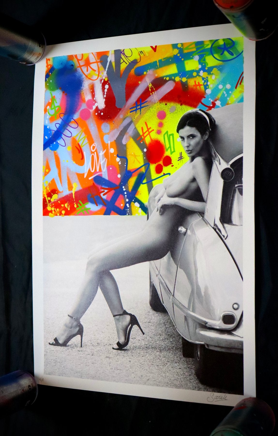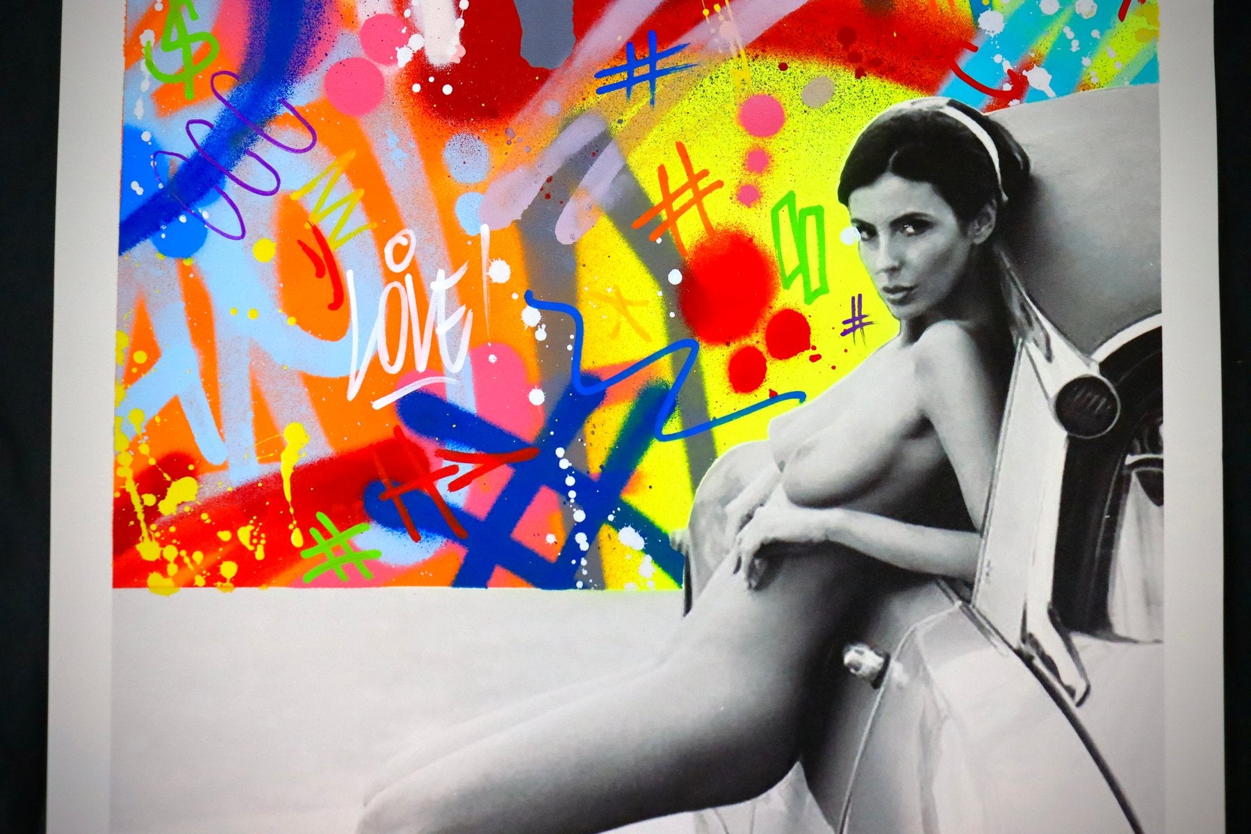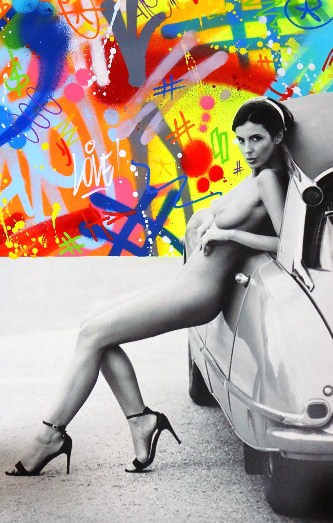 Let's Go for a Ride by Socrate is a vibrant and dynamic mixed-media artwork on paper, expertly combining acrylic with bold and expressive elements. Hand-signed by the artist, this piece captures the energy and freedom of its title with striking colors and textures.